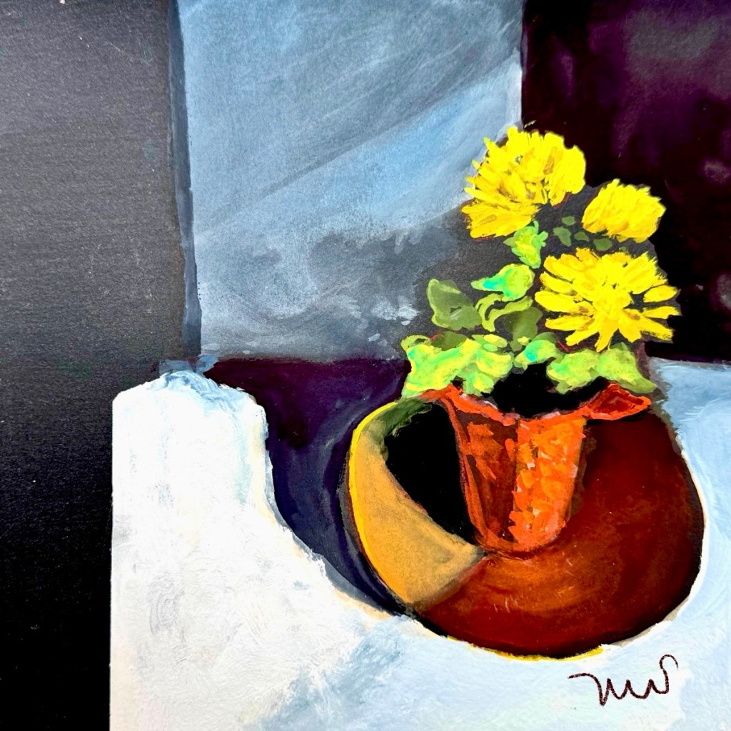This is from our Tuesday night Zoom session. The orange and red foil that wrapped around the flower pot was reflected in the round saucer, and I kept applying layers, trying to match the coppers, bronzes, and reds that I saw. I ended up with far more paint on the page than I usually use, and I am pleased with the look of the color.