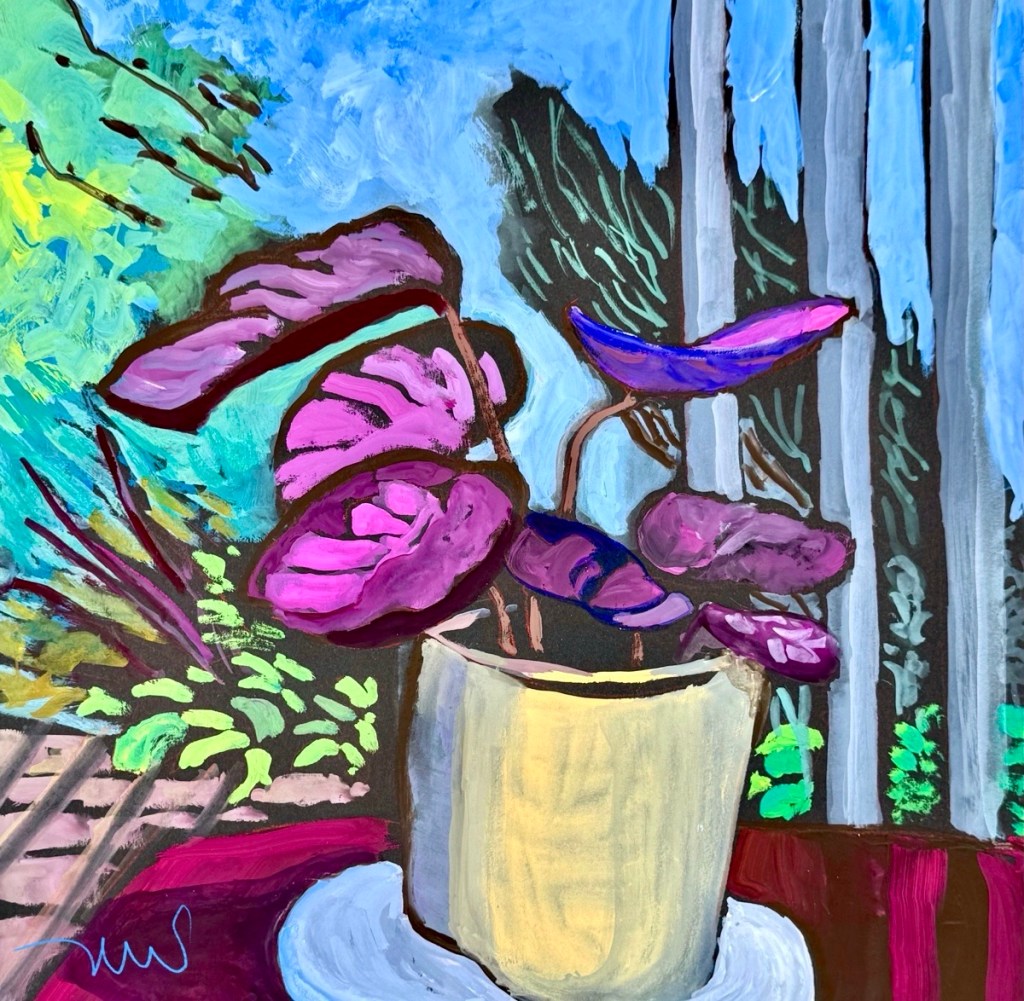 This houseplant sits on a table near the plants in the patio garden. I like the close-up of the plant’s features against the mix of shrubbery outside.