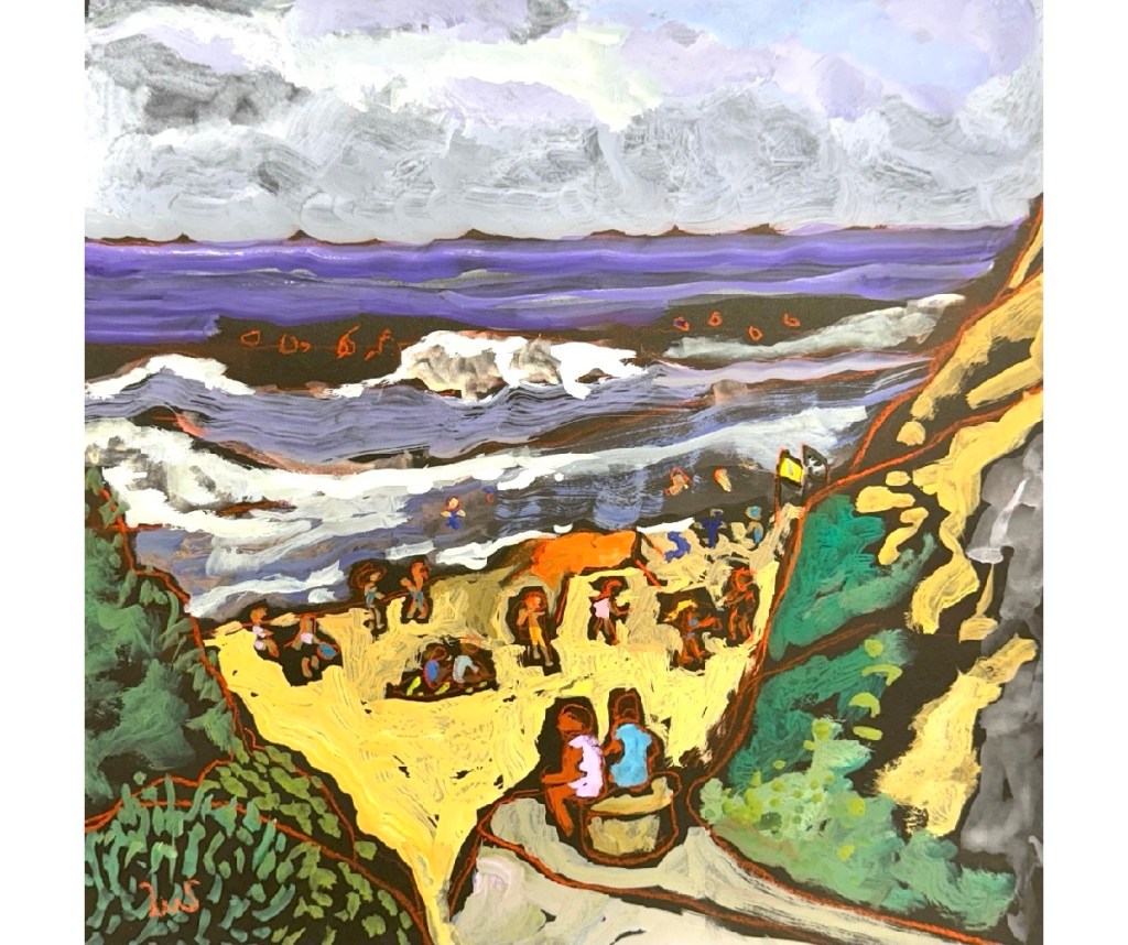This morning, the San Diego Urban Sketchers met at Fletcher Cove in Solana Beach. The cove is a narrow stretch of beach that opens from a space between steep hillsides. We painted from a lookout point that looked down on everything. By 9 a.m., the beach was full of people enjoying themselves, and I wanted to capture that busy, happy vibe.