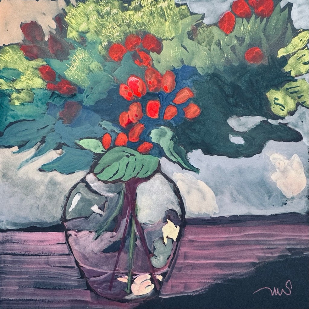 This is based on a friend’s photo. I loved the many dark, murky colors in the bouquet, and it was a perfect candidate for gouache on black paper.