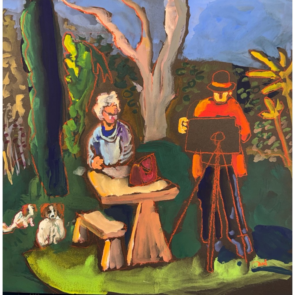 I had just finished a different painting when I looked over and noticed how the two pups were defending us from frogs—and how engrossed my two friends were in their work. My gouache and red pastel pencil were ready, so I turned the page in my sketchbook and jumped in. I like how I caught the alert dogs and the artists’ focus on their paintings.
