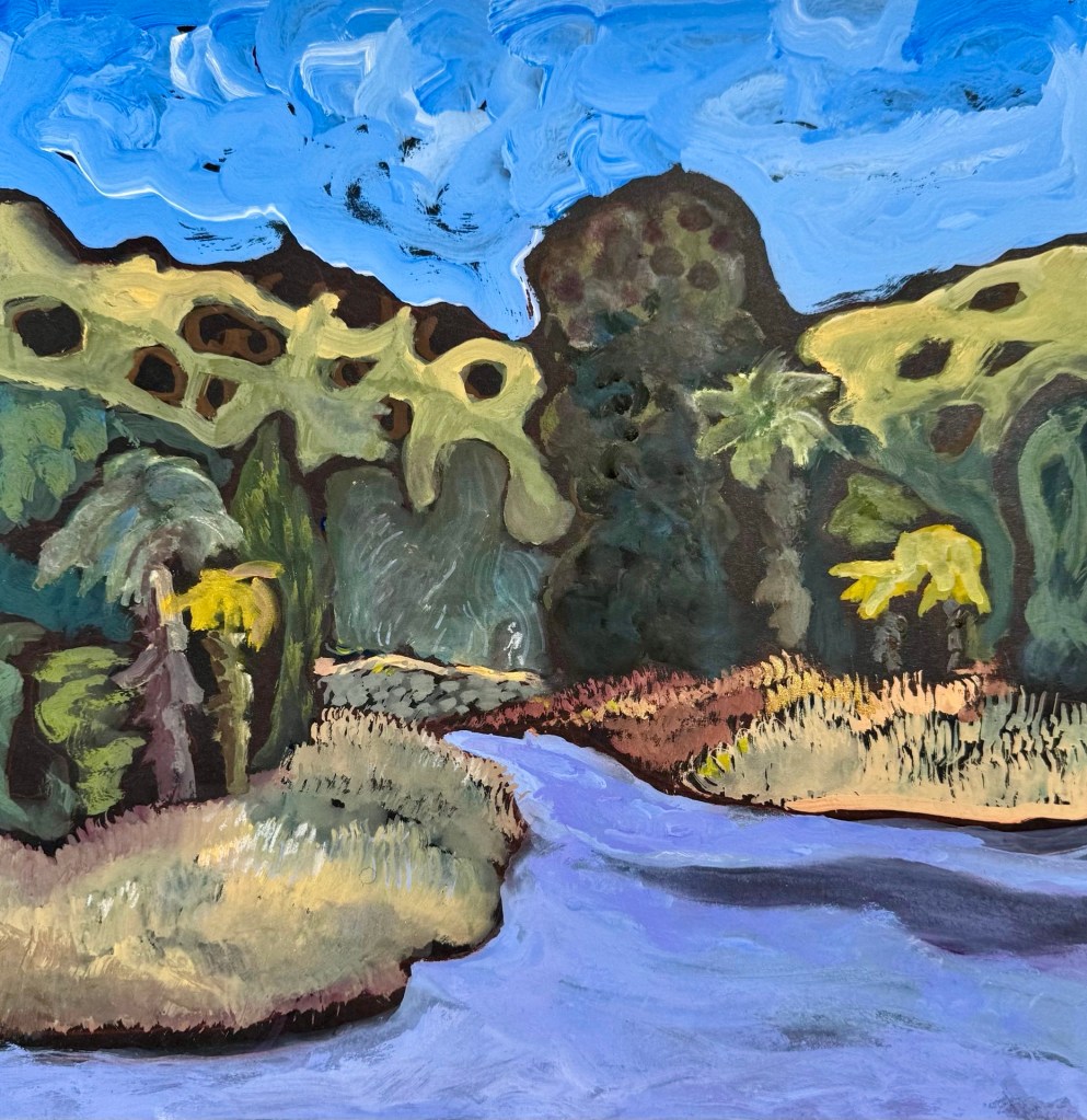 This is a 13 x 13-inch gouache plein air painting on dark paper.