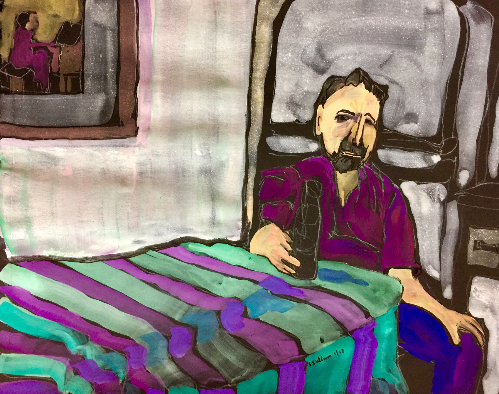 Sketch of a tired man drinking a beer by Sarah Sullivan