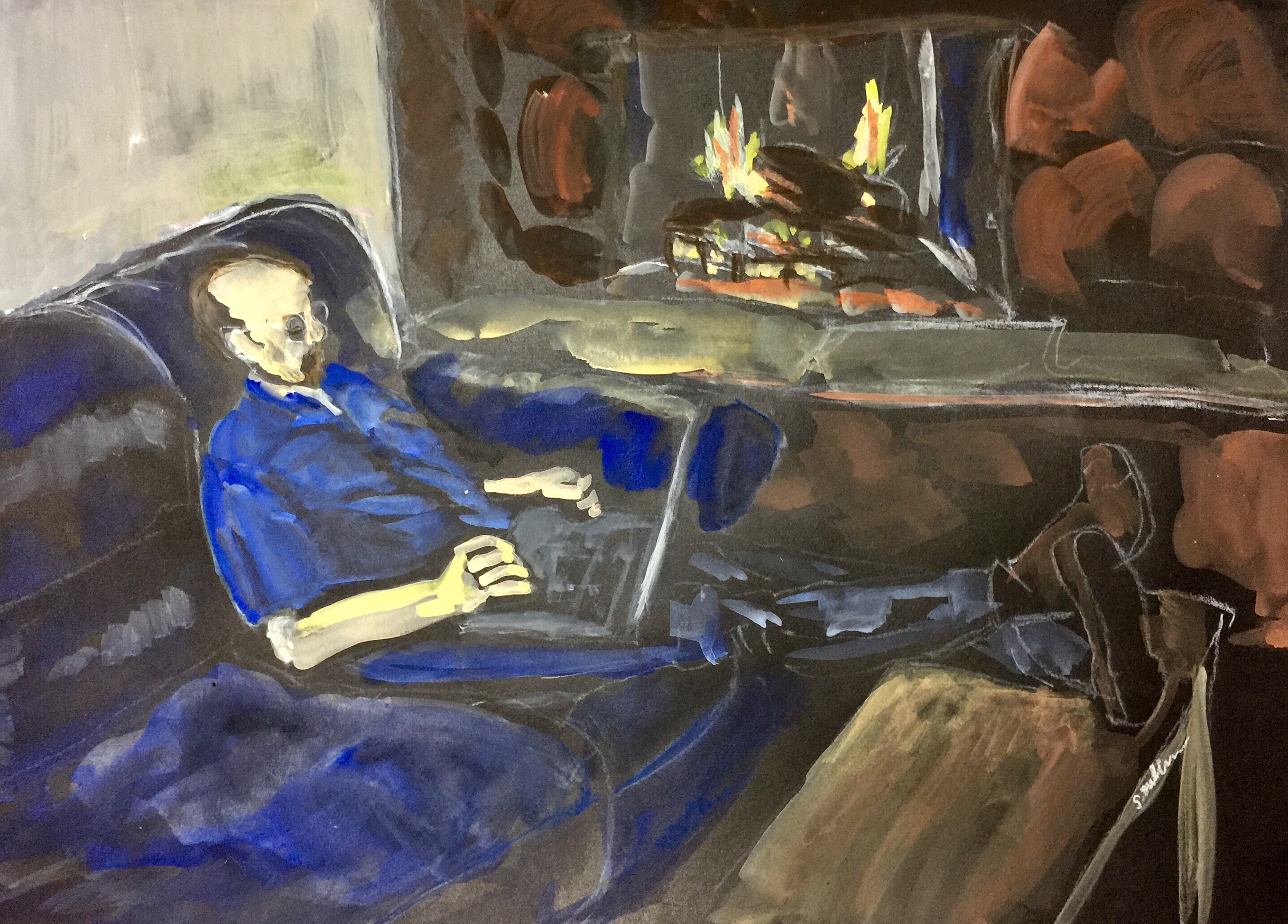 Sketch on a man working by his fireplace by Sarah Sullivan