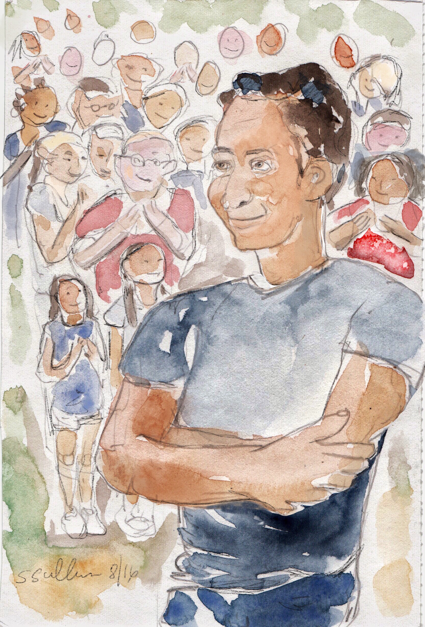 Sketch of a man being cheered by Sarah Sullivan