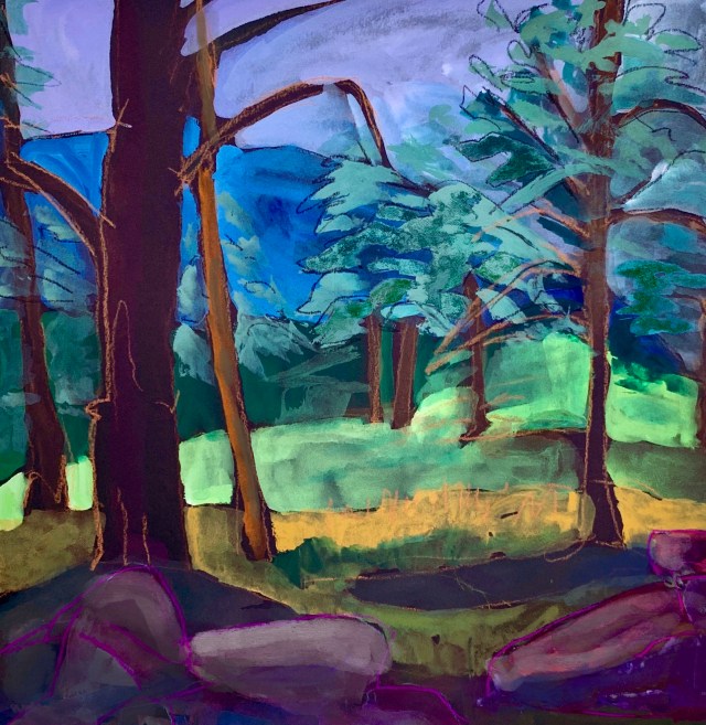 I was standing in the woods painting as the color of the sky and forest began to change because thunderheads were forming. So I tried to capture the feeling of a coming storm.