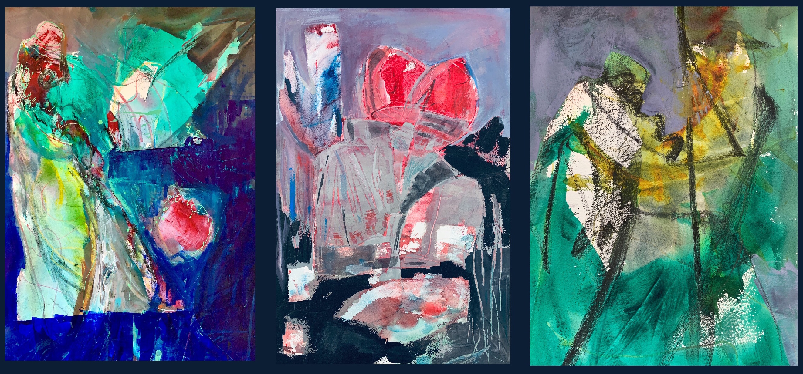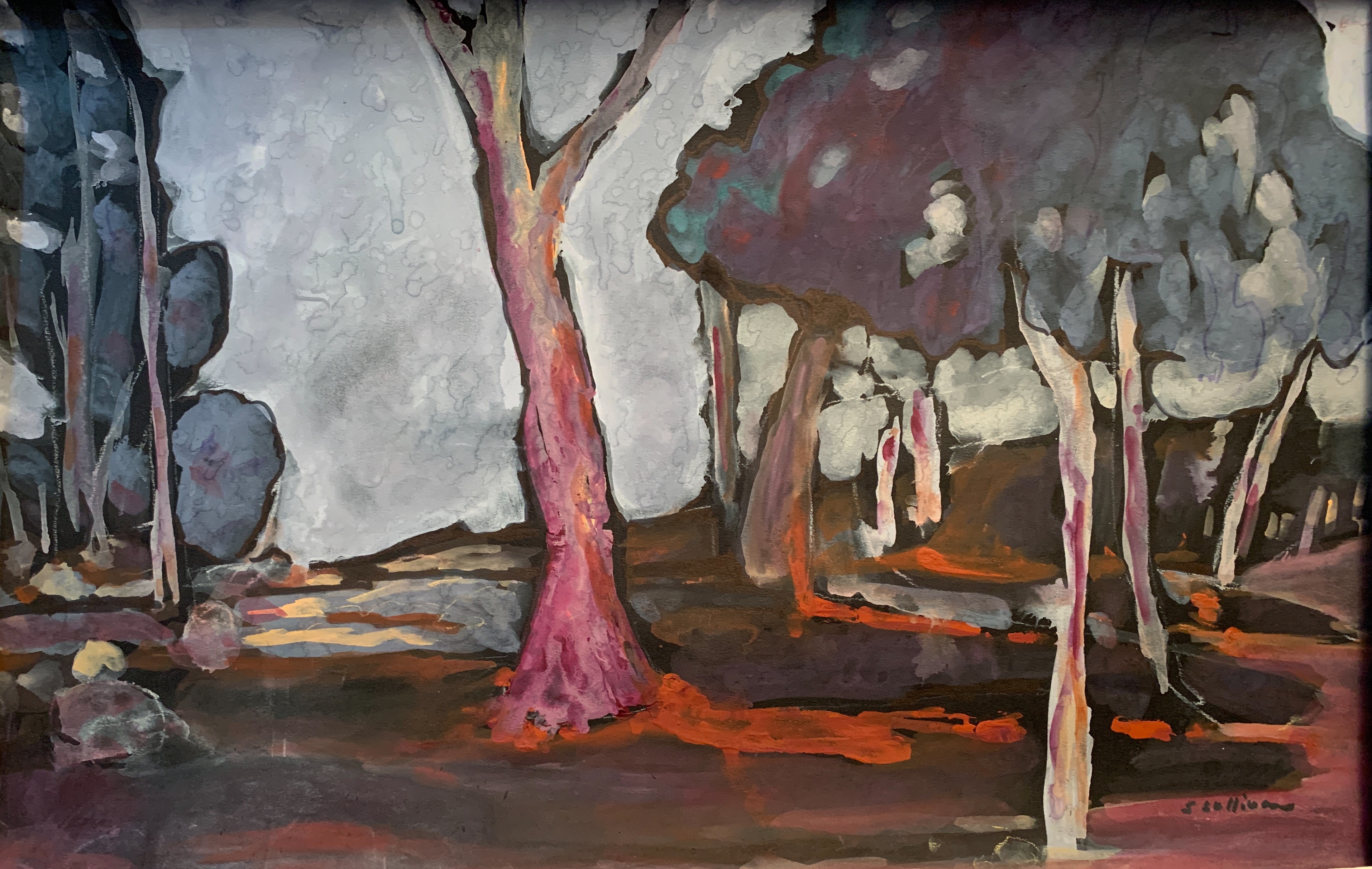 This is a mixed media painting. I began with black bristol board and gave it a coat of burnt sienna casein. I drew on it with yellow pastel and ink and painted with gouache.