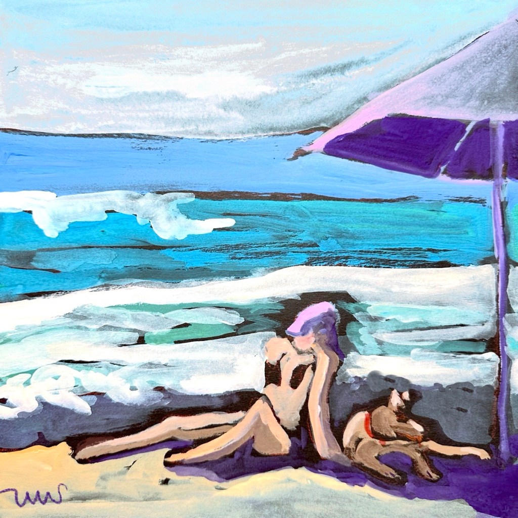 The Thursday painters met today at the Wedding Bowl in La Jolla and painted the view. Too much was going on at this popular location to paint it all, so I simplified away the vehicles and most of the people, but here are two lucky dogs who were there with their owners.
