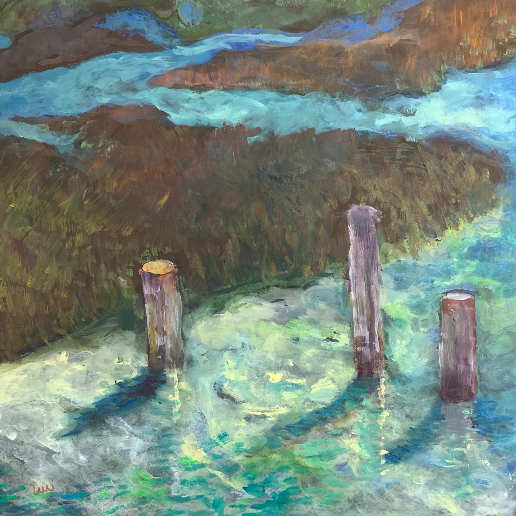 Two days ago, I painted at the San Dieguito Lagoon north of San Diego. It was my first time painting away from my home since the COVID numbers exploded last fall. It was great to be out, and I used up a lot of my morning before choosing a scene to paint. Despite the many compelling scenes, these three pilings by the edge of the lagoon captured my attention. I liked the play of their shadows and reflections in the moving water and their contrast with the wedges of land that came in from both sides. I didn’t finish while I was at the lagoon but was able to do so today.